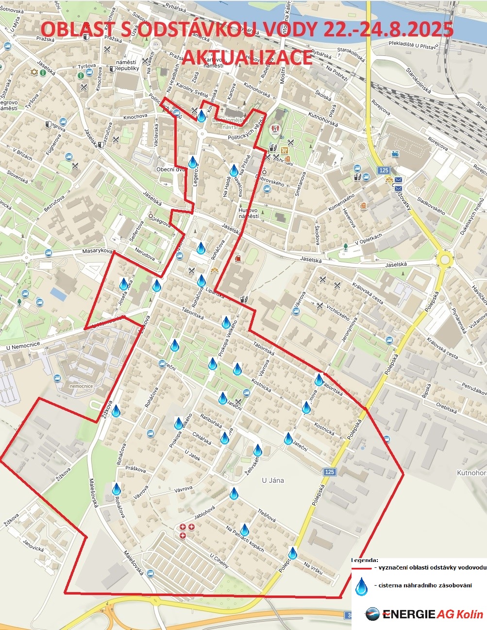 AKTUALIZACE II: Vážení odběratelé, dovolujeme si Vás informovat, že plánovaná odstávka dodávky vody v lokalitách Kolín I, III a IV byla úspěšně ukončena a dodávky vody jsou postupně obnovovány. V souvislosti s obnovou dodávek může na některých místech docházet k dočasnému zákalu vody, který je způsoben zvířením železitých usazenin ve vodovodním potrubí. Naši pracovníci aktuálně provádějí odkalování vodovodní sítě, aby byl zákal co nejdříve odstraněn. Děkujeme Vám za pochopení a trpělivost. Energie AG Kolín